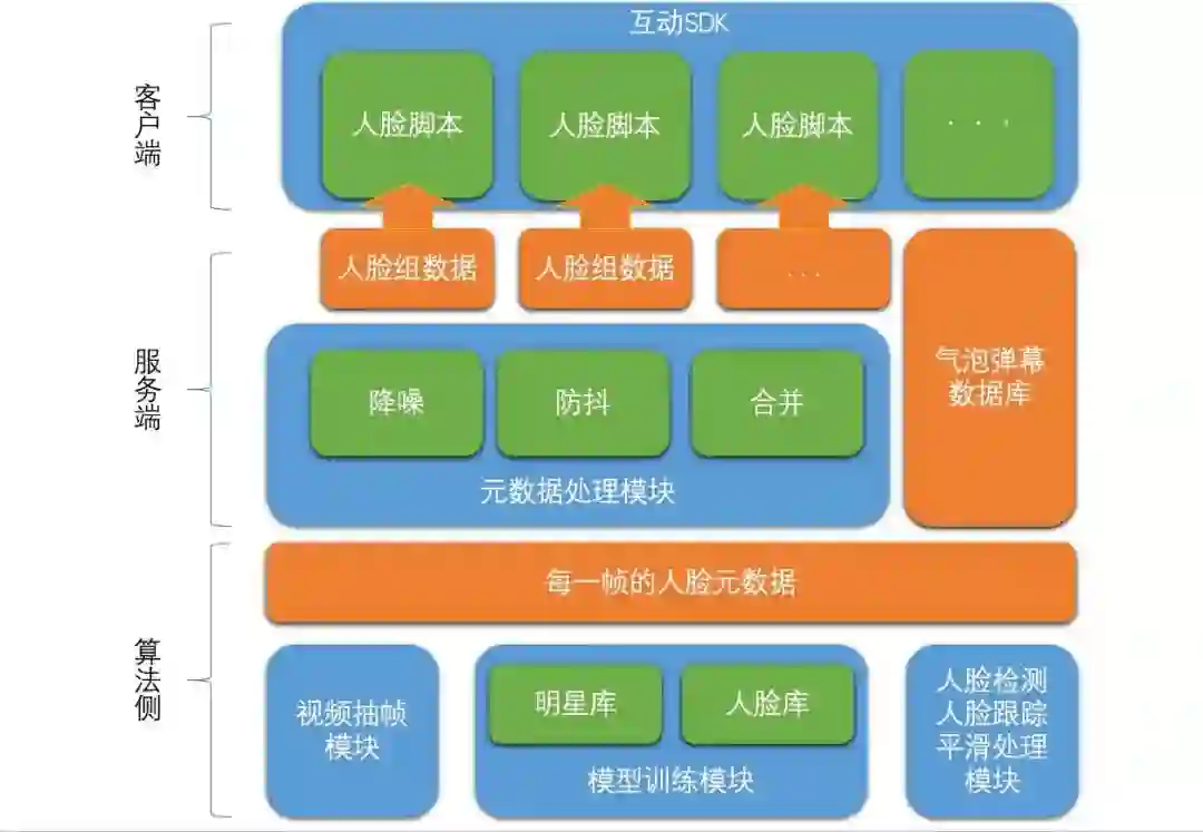 人脸跟随弹幕的架构分成算法侧、服务端、客户端三层:
