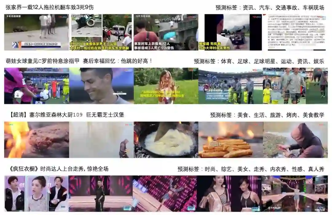 如何为用户推荐真正想看的视频,这离不开对视频内容的理解,在个性化视频推荐中,为了对视频的内容进行表征,一种常用的方法是给视频打上多个标签,每个标签代表了一个视频中的主要元素。优酷过去的标签算法主要依赖于文本分析,当视频的文本元信息(标题、描述、评论等)对主题的描述不明确时,我们常常无法分析视频内容。为了解决这一问题,我们采用文本、封面图、音频、视频多种模态信息对视频进行多标签分类,大大提高了建模的准确率。从而提升推荐成功率。