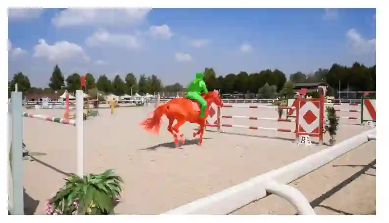 视频物体分割(Video Object Segmentation,简称 VOS ),顾名思义就是从视频所有图像中把感兴趣的物体区域完整的分割出来。为了方便大家的理解,先给出一个我们自己的视频物体分割的结果: