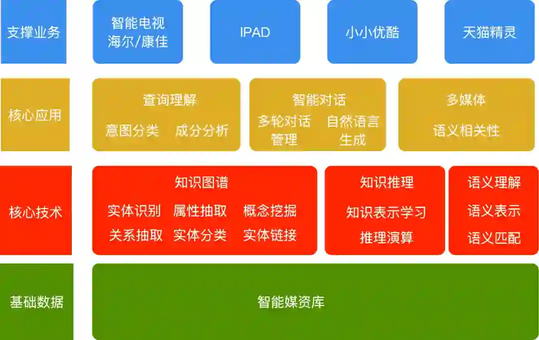 交互式搜索系统采用模块化的设计思路,按照分层逻辑结构,分为应用技术层、核心技术层和基础数据层。应用技术层主要包括是自然语言理解(NLU)和对话技术,其中 NLU 包括意图理解(Intent Understanding)技术和成分分析((Slot Filling)技术;对话技术包括对话管理(DM)以及对话生成(NLG)。核心技术层包括知识图谱(Knowledge Graph)的构建和推理应用。基础数据层是基于视觉技术的智能媒资库。