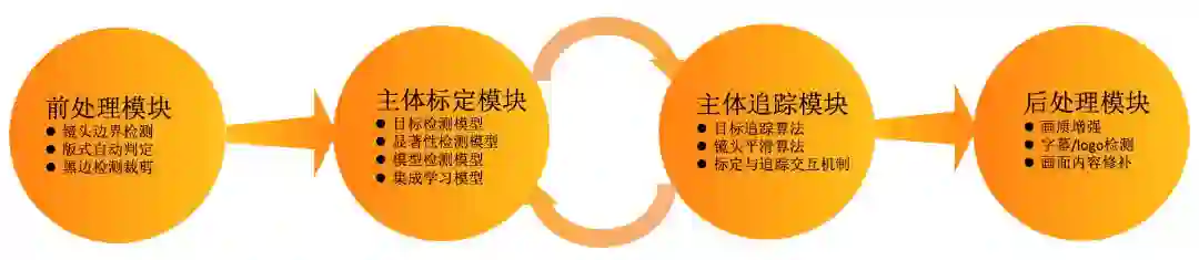 在视频智能裁剪技术链路中,我们研发了前处理模块(包含镜头切分, 画面尺寸判定,黑边检测裁剪等),主体标定模块,主体追踪模块和后处理模块(包含画质增强,字幕/logo 检测,画面内容修补等)。