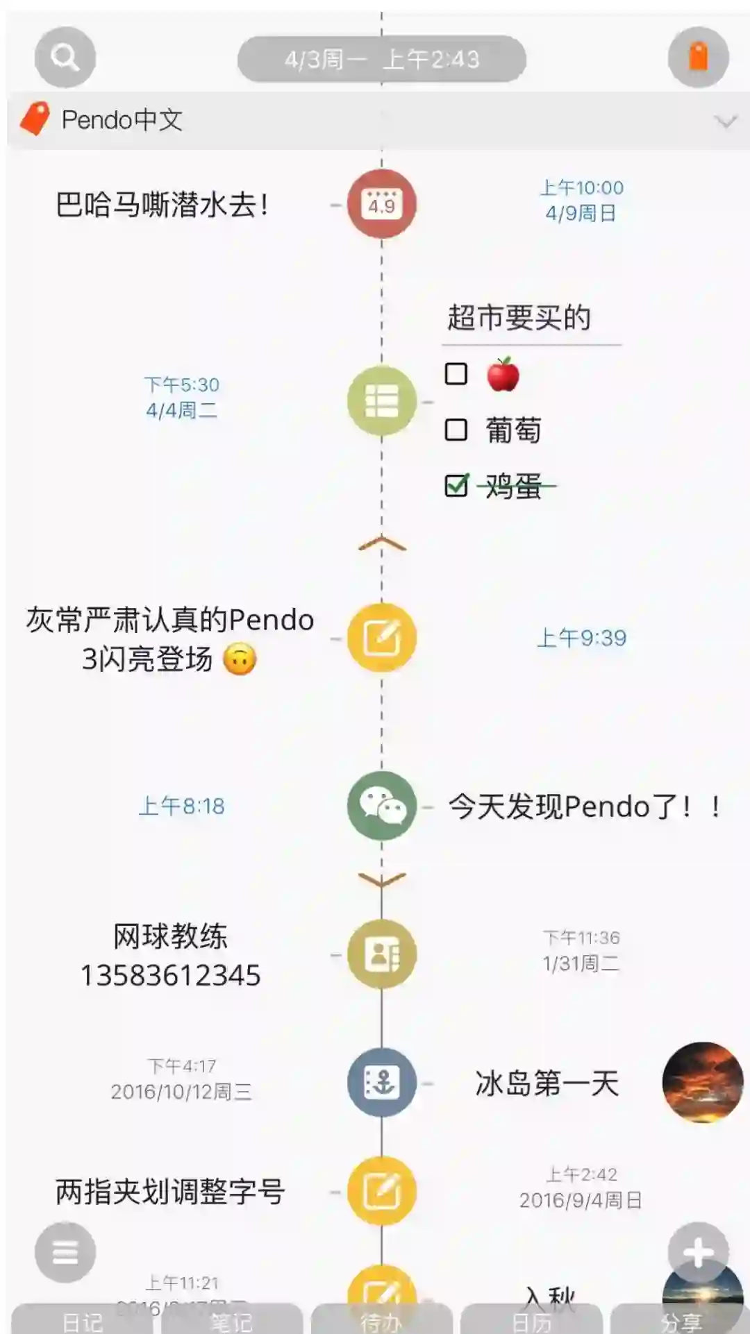 所有操作过的痕迹,无论是个小笔记, 一个开会日程,还是一个超市买水果的待办单子,都会留在 Pendo 里, 成为记忆的一部分, 这些不得不做,或是无心之作的小事,或许才是我们人生经历里最宝贵,最值得回忆的小幸福,Pendo 把他们用时间串起来,等你回头来看。