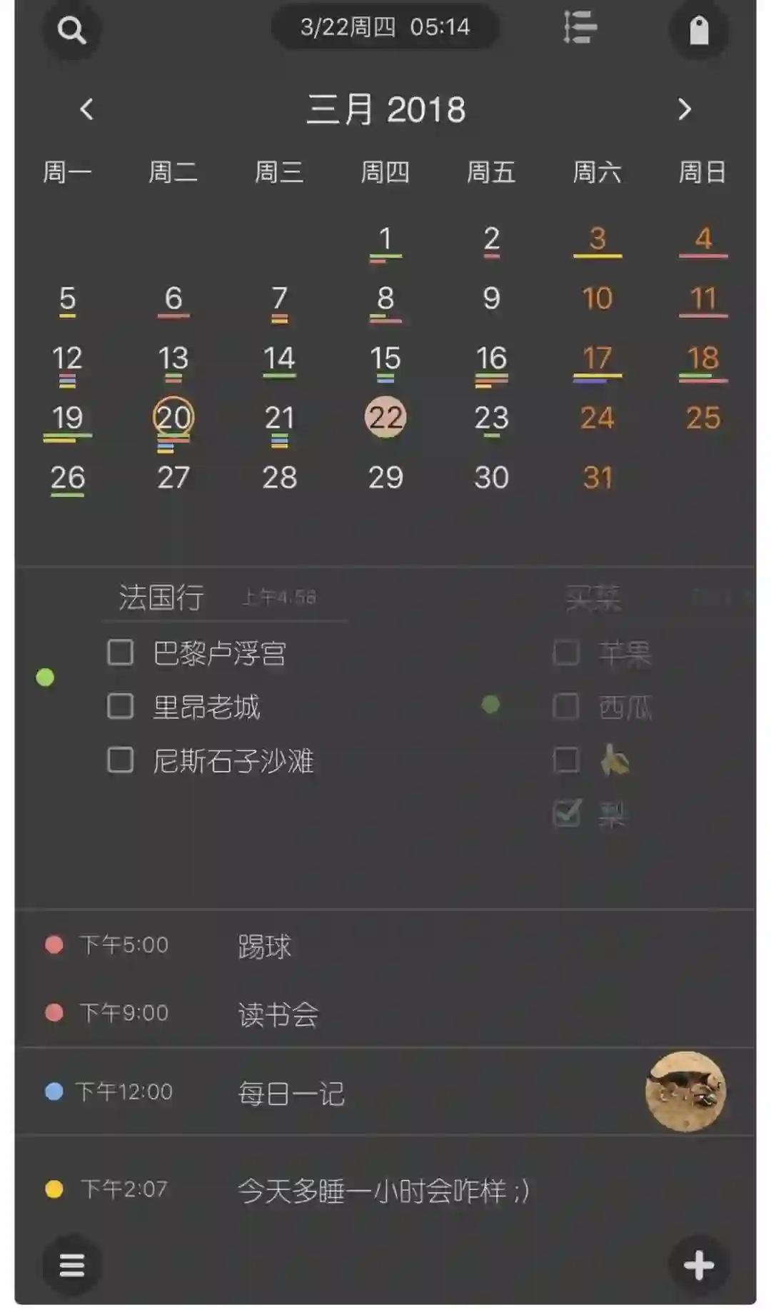 而当我们开启日历视图,就可以一眼看出每天有多少各个类型的笔记——工作、学习、娱乐,清清楚楚,明明白白。