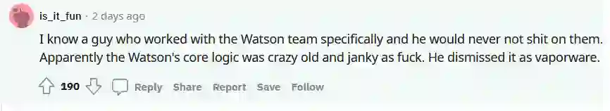 「我认识原先在沃森健康工作过的人,提起产品没有一句好话。很显然,沃森的核心逻辑老掉牙还很烂。他将之描述为太监软件。」