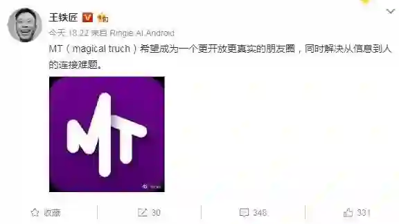 36氪讯,快播创始人王欣今日发布微博称,“MT(magical truch)希望成为一个更开放更真实的朋友圈,同时解决从信息到人的连接难题。”同时,“马桶MT”官网中,原有的“马桶MT”字样均已改为“MT”。