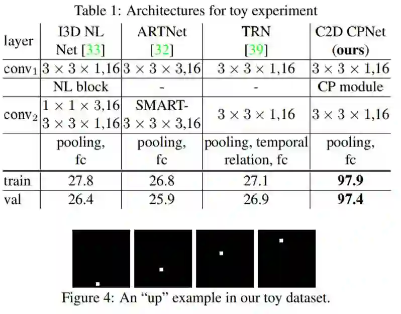 文中自己建立了一个小数据集,只有上下左右的方块运动,然而NL,ARTNET,TRN都表现不好,只有CPNet表现好,侧面烘托出CPNet能学到更多的位置信息。