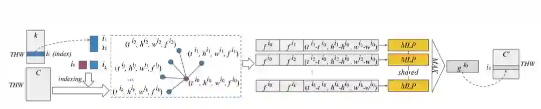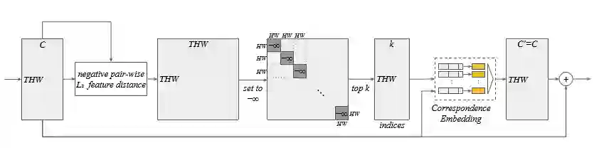第一步,为了提取出前K个对应关系,它使用top-k的方法来提取。既然为了提取对应关系,那么先要进行矩阵乘法来得到,一个(THW,THW)的矩阵,与Non-local不同的是它计算相关性使用Negative l2距离,同时它为了避免和自己的相关性也计算进去,将左上角的对角线那个值全部设为负无穷,随后使用top-k来的到一个(THW,K)的对应关系。