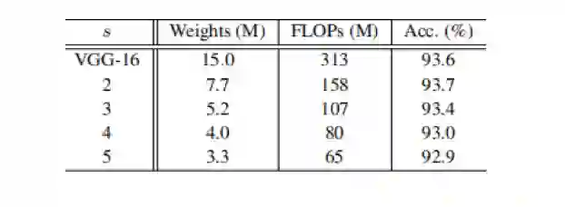 因此,我们在接下来的实验中采用d = 3进行实验。s与得到的网络的计算代价直接相关,s越大,压缩比越大。当我们增加s的时候,FLOPs明显减小,准确率逐渐降低,这与预期一致。特别是当s = 2表示将VGG-16压缩2倍时,本文方法的性能甚至比原模型稍好一些,说明了所提出的Ghost模块的优越性。