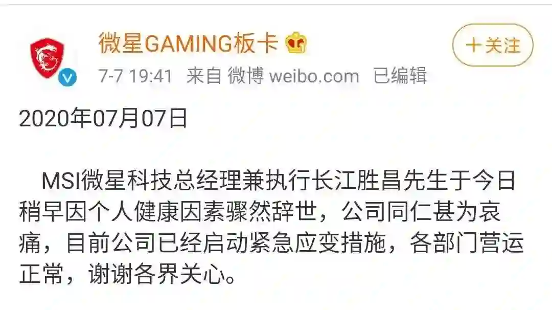 7月7日晚间消息,微星科技官方发布公告,确认公司总经理兼 CEO 江盛昌于今日稍早因个人健康因素骤然辞世。微星表示,公司同仁甚为哀痛,目前公司已经启动紧急应变措施,各部门营运正常。公告发布后,大量微星用户和网友纷纷表达哀悼。