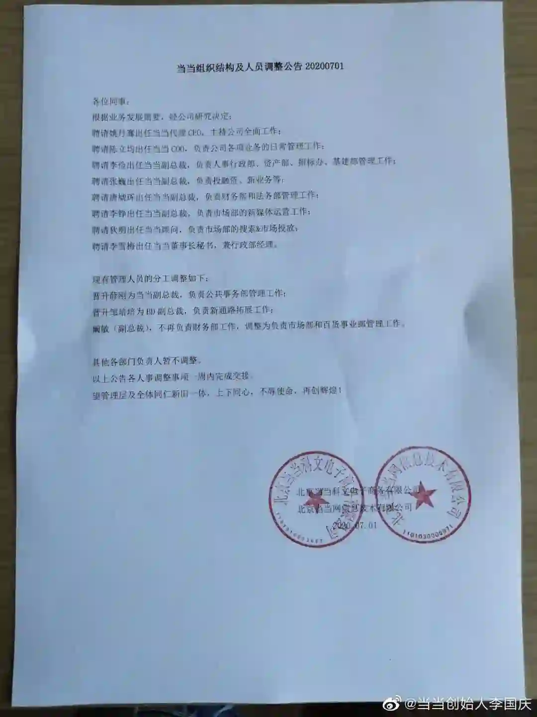 36氪获悉,李国庆昨日下午宣布调整当当网组织结构及人员。聘请姚丹骞出任当当代理CEO,主持公司全面工作;聘请陈立均出任当当COO,负责公司各项业务的日常管理工作。