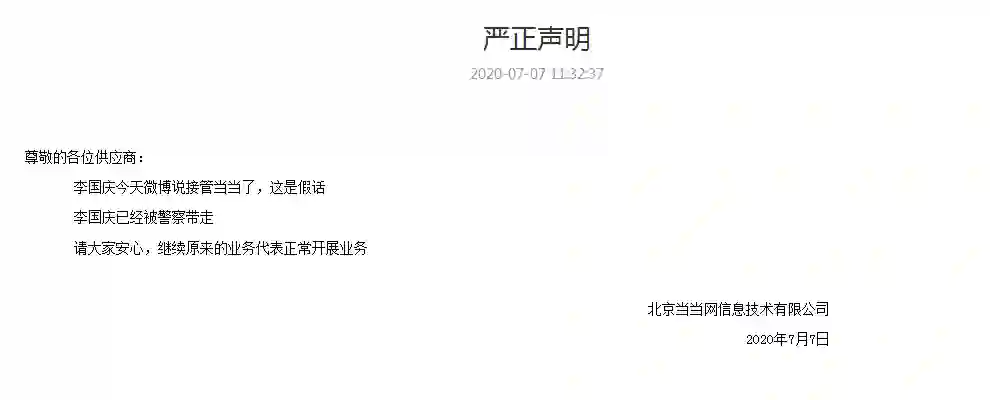 当当网方面向供应商发表严正声明:李国庆今天微博说接管当当了,这是假话。李国庆已经被警察带走。请大家安心,继续原来的业务代表正常开展业务。(第一财经)