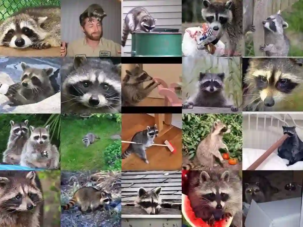 我从Google Images和Pixabay爬取了200张浣熊的图片(主要是jpeg格式,也有个别是png格式),并且确保了图片在大小、姿势和光线方面有所区别。下面是我收集的一部分图片。