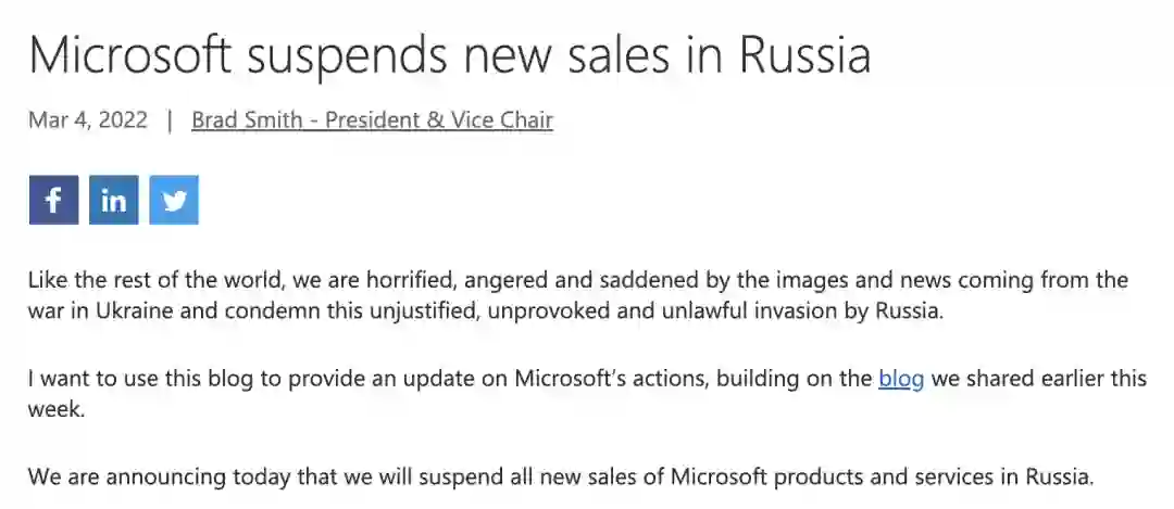 当地时间3月4日,微软总裁兼首席法务官Brad Smith宣布,将暂停在俄销售所有新的产品和服务。