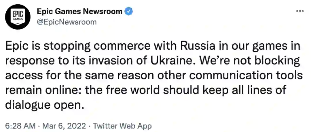 除了动视暴雪,还有著名的游戏开发商Epic Games也加入这个行列,并指出不会禁止俄罗斯玩家访问游戏。