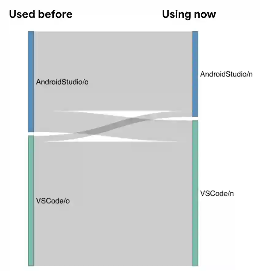 △ 图 4. 更多开发者将主要 IDE 从 Android Studio (蓝色) 换成 VS Code (青色),反向改换的人则很少。