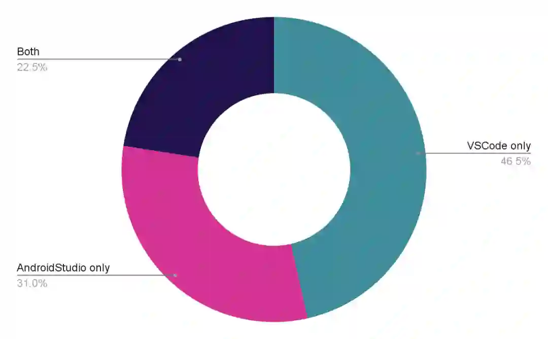 仍然有大约 23% 的 Flutter 开发者同时使用 VS Code 和 Android Studio。当询问他们为什么使用多个 IDE 时,最常见的回答是,VS Code 用户需要使用 Android Studio 和 Xcode 来实现特定于原生设备的功能,例如模拟器设置、构建配置、发布需求 (例如密钥生成和签名),以及开发 Flutter + 原生混合式应用。