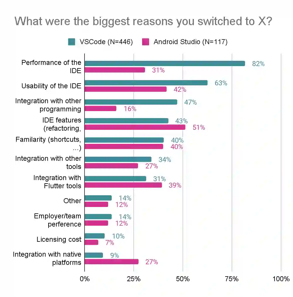 如下图所示,转用 VS Code 的人喜欢它的性能 (82%) 和易用性 (63%)。另一方面,转用 Android Studio 的人喜欢它的功能 (51%)、与 Flutter 工具的集成 (39%) 以及与原生平台的集成 (27%)。