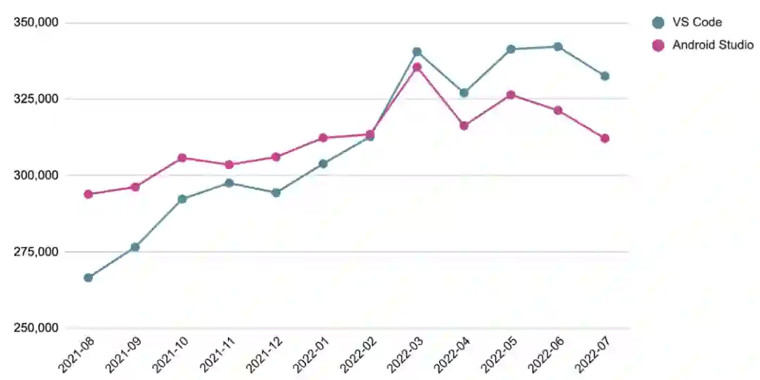 Google 的 Flutter 团队负责构建和维护 Android Studio (基于 IntelliJ-IDEA) 和 Visual Studio Code (VS Code) 的支持。我们将代码补全、语法高亮、widget 编辑辅助、运行和调试等功能集成到这些 IDE 插件中,用于 Flutter 应用开发。Flutter 开发者们从一开始就有在使用这两种 IDE,Android Studio 以前比 VS Code 更受欢迎,不过 VS Code 近期在 Flutter 开发中的热度一直在稳步增加,最近甚至超过了 Android Studio,如下文图中所示。