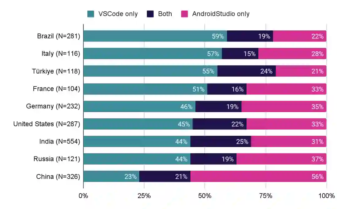 我们从调研中还了解到,不同国家或地区的 Flutter 开发者偏好不同的 IDE。尽管大多数 Flutter 开发者更偏好 VS Code,但中国的开发者相较于 VSCode (23%) 还是更偏好 Android Studio (56%)。我们发现这很有趣——Flutter 在全球范围内都有被广泛采用,但又往往处于不同的开发环境中。无论您来自哪个国家或地区,如果您有任何围绕这一倾向的故事,欢迎和我们分享。