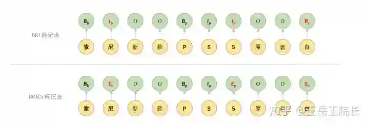 这里说一下用于表示序列标注结果的 BIO 标记法。序列标注里标记法有很多,最主要的还是 BIO 与 BIOES 这两种。B 就是标记某个实体词的开始,I 表示某个实体词的中间,E 表示某个实体词的结束,S 表示这个实体词仅包含当前这一个字。区别很简单,看图就懂。一般实验效果上差别不大,有些时候用 BIOES 可能会有一内内的优势