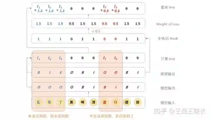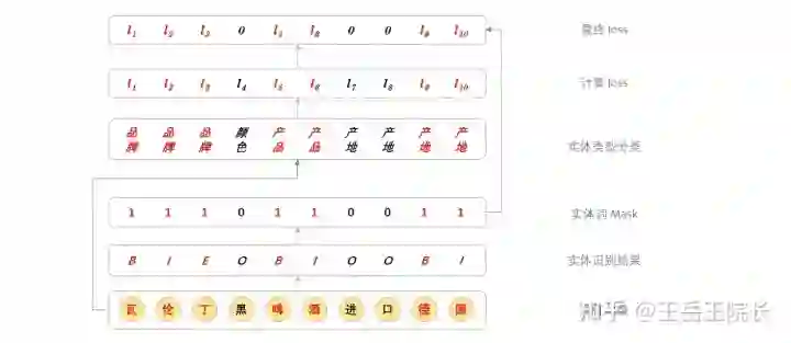 具体实现上这样写:在训练时,每个词,无论是不是实体词,都过一遍全连接,做实体类型分类计算 loss,然后把非实体词对应的 loss 给 mask 掉;在预测时,就取实体最后一个词对应的分类结果,作为实体类型。上图解释