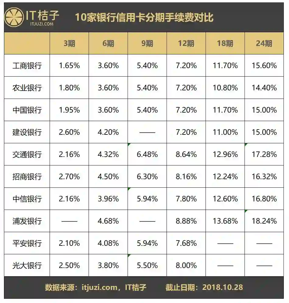 各银行最新的分期手续费对比见下表(截至 2018 年 10 月):