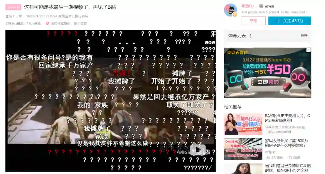 以B站拥有40万粉丝的UP主“布鲁sir”为例,他在现实生活中是一个坐拥亿万资产的富二代,在B站上却始终不愿意展示自己的身份;最后因为不想做过于迎合市场的视频,一年半亏损90W,无奈回家继承亿万资产,临走前还发了一支将近18分钟的告别视频。