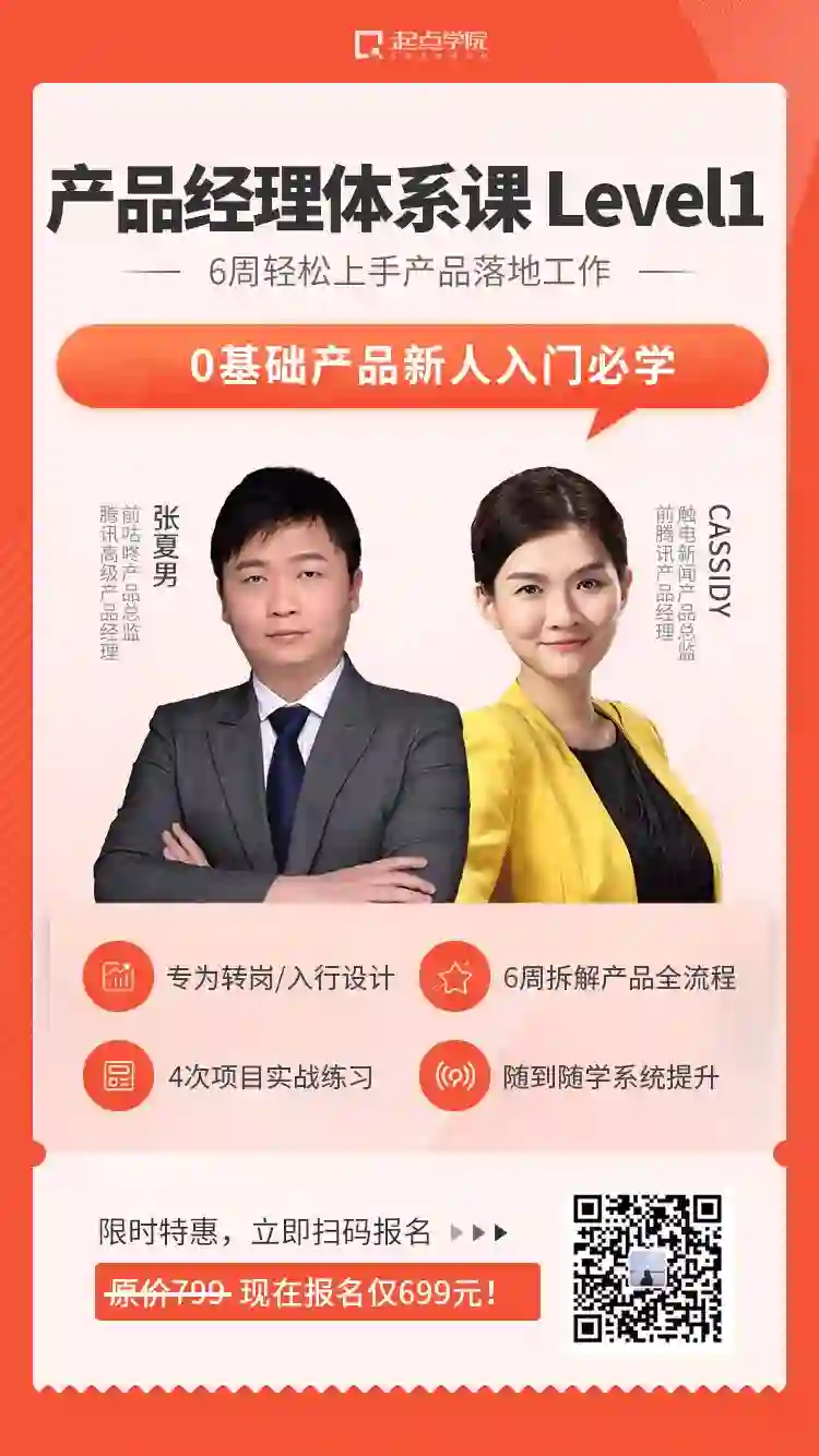 推荐起点学院全新上线的【产品经理体系课 Level1】0基础线上入门课,两位授课老师拥有10年以上互联网产品经验,在起点学院领教5年,帮助过3000+产品新人入行成,6周线上亲自带教,4次实战练习,帮你告别零经验小白状态,快速上手产品工作,扎实产品基本功,成为拥有个人竞争力的产品新人!