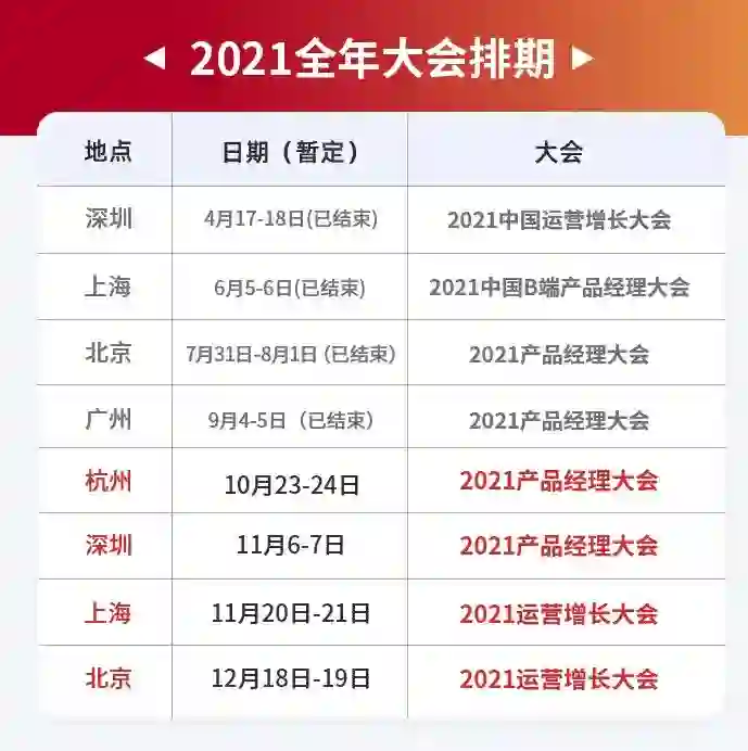 2021 产品经理大会最后一场深圳站,2021 运营增长大会上海、北京站即将开幕!全年最后 3 场大会,全部开启售票!