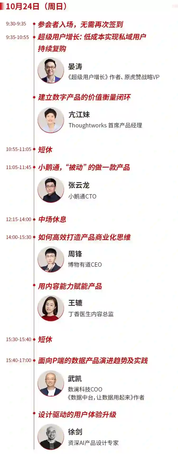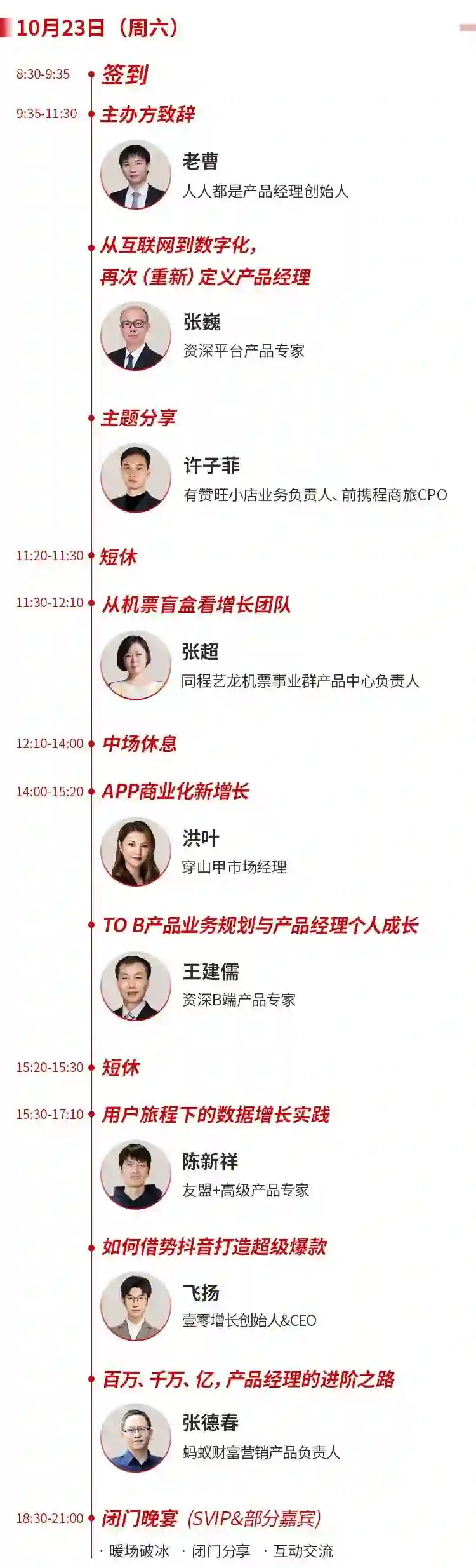 2 天大会,15 位实战专家将从产品经理能力升级、商业化、增长等多个话题维度展开分享,安排满满哟: