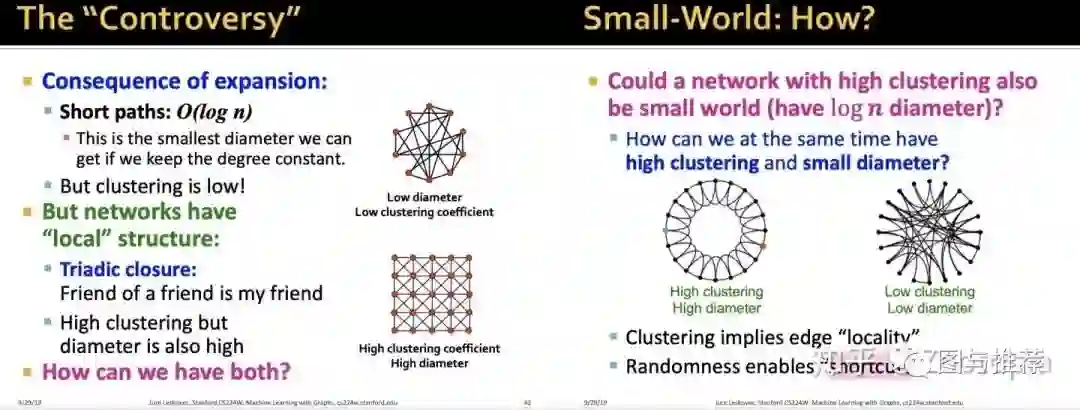 聚合系数和直径之间有一个矛盾之处在于:图的扩展(expansion)会使得保持度不变的情况下,直径越小也会导致聚合系数越小;而高聚合系数(高度连接的网络)却往往直径很大。那么怎么解决这个矛盾?基于以下两个思想: