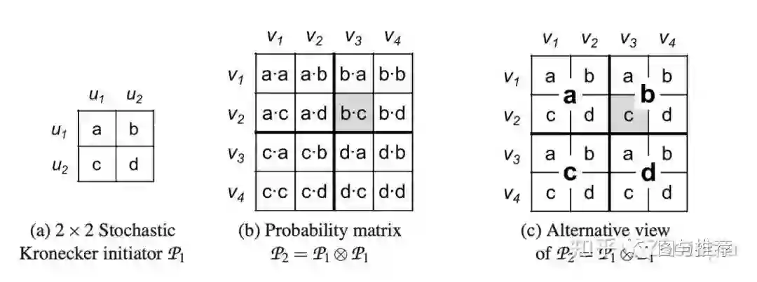 (2)对初始矩阵进行Kronecker积运算,以获得较大的随机邻接矩阵,在该矩阵中,大型矩阵的每个元素数值再次给出了特定边出现在大图中的概率,这样的随机邻接矩阵定义了所有图的概率分布