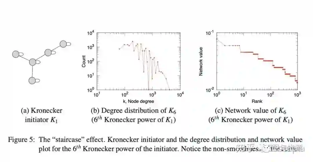 尽管到目前为止讨论的Kronecker结构产生的图具有一系列所需的特性,但其离散性质在程度和频谱数量上会产生“阶梯效应”,这仅仅是因为单个值具有较大的多重性。例如,图邻接矩阵的特征值的度分布和分布以及主要特征向量分量的分布(即“网络”值)都受此影响。这些数量是多重分布的,这导致具有多个重复的单个值。下图说明了阶梯效应(这部分来自lecture讲解人的论文https://dl.acm.org/doi/10.5555/1756006.1756039
