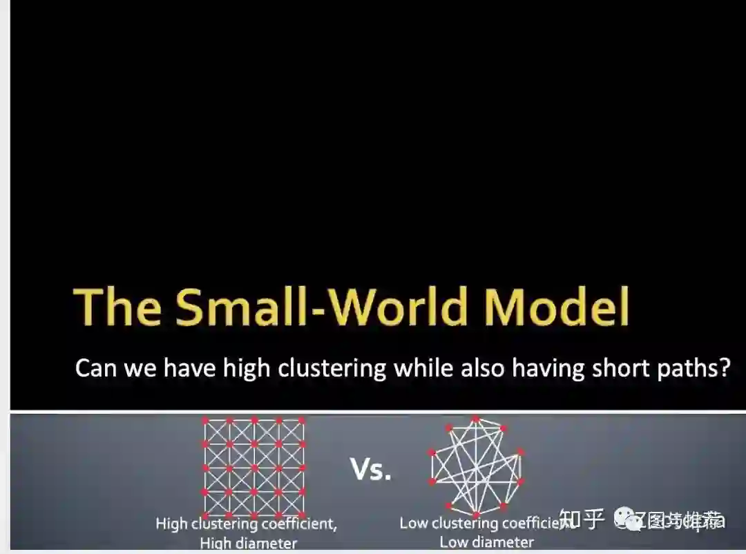 (1)高聚合系数:我的大部分朋友们互相都认识(2)低直径:但是我也有几个朋友在另一个城市,且他们和其他朋友互不认识