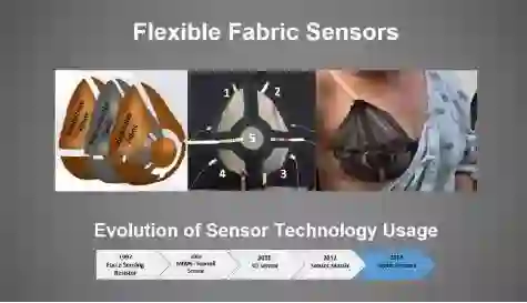 比如下图所示,新的传感器材料比较轻薄,可以被剪裁成五个部分,制成胸部乳房传感的可穿戴式检验设备。