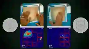以下图为例,能看出右边的检查力度比左图的正确手法轻了许多,这就意味着右边的医生非常有可能错过病变区域的肿块。这样的教学方式让学习的体验更加直观。