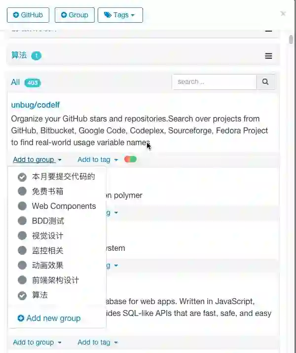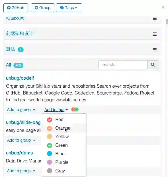 Codelf 还可以帮助开发者管理 Github 上的项目。我们看到一个喜欢的项目,第一个操作肯定是先点一下 Stars,时间久了,项目越来越多,快速检索到当下想用的是一个非常 nice 的功能,正好 Codelf 也具备这个功能。大家可以把想收藏的项目的 username 输入,然后进行分组或者直接用七个颜色的 Tag 简洁标记一下就可以了。不用绑定自己的 Github 账号。