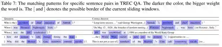 本文对模型进行语义匹配时,对问题和答案中相对重要的词进行了可视化,如下图所示,由图可知,在语义匹配的过程中,本文提出的模型确实选择出了一些相对重要的词,以此可匹配到问题答案对,从而对模型的匹配结果进行了解释。
