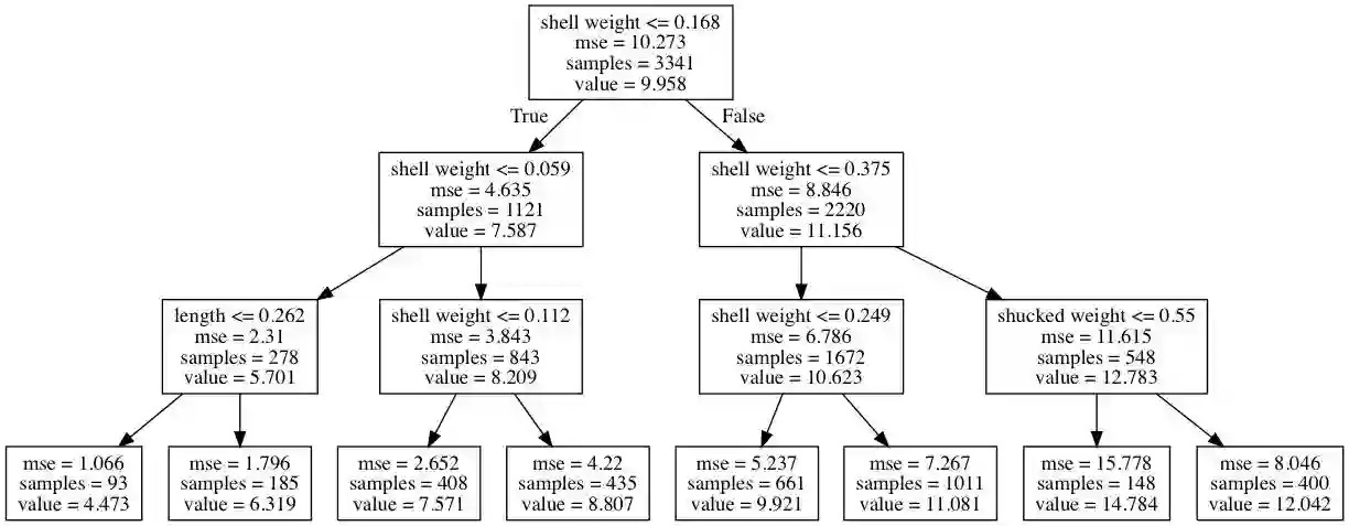 Let’s use the abalone data set as an example. We will try to predict the number of rings based on variables such as shell weight, length, diameter, etc. We fit a shallow decision tree for illustrative purposes. We achieve this by limiting the maximum depth of the tree to 3 levels.