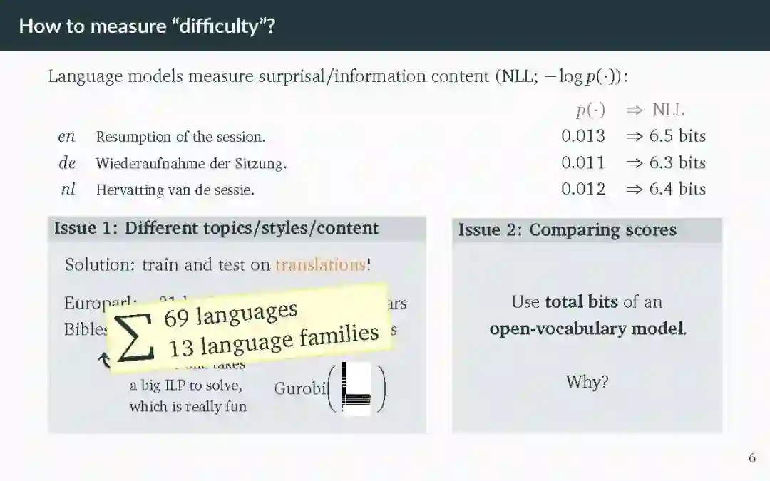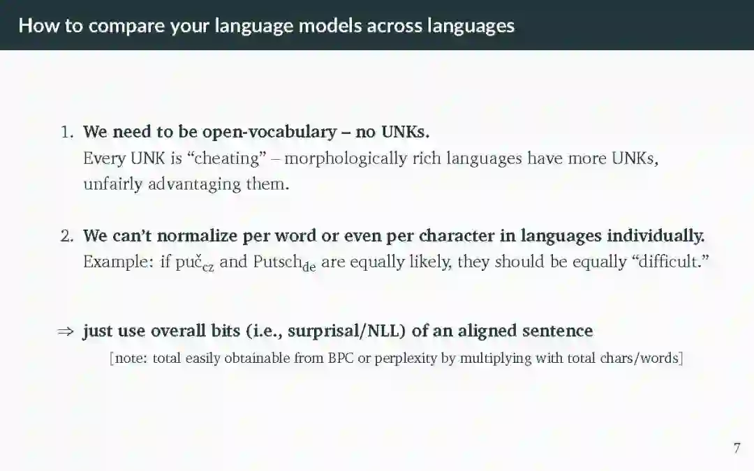本讲座的大部分内容将致力于两篇论文,它们试图做到这一点:通过使用概率和基于信息理论的度量,公平地比较生成模型的表现。第一篇论文详细介绍了如何通过总比特来评价(单语)开放词汇语言模型,第二篇论文思考了“信息”的意义以及如何使用它来比较机器翻译模型。