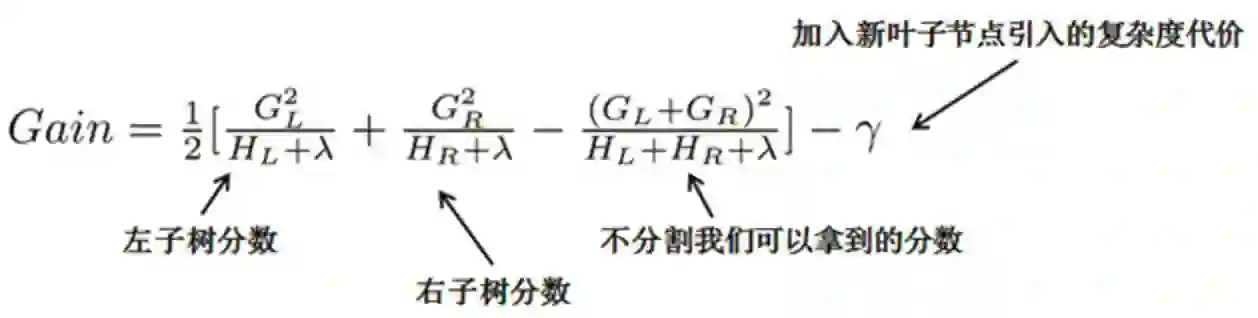 众所周知,针对节点分裂的方法,ID3算法采用信息增益、C4.5算法采用信息增益率和CART采用Gini系数,而xgBoost是基于结构分数设计的,对于特定的节点分裂方案,其增益计算公式如下:
