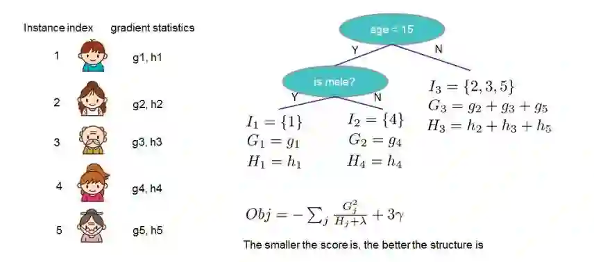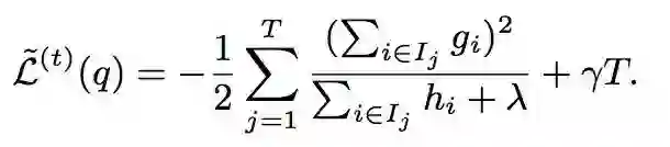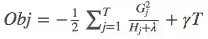 由上图可知,只要loss function确定后,通过计算每个样本的gi和hi值,进而计算每个叶节点的Gj和Hj值,就可以得到一个回归树的结构分数。