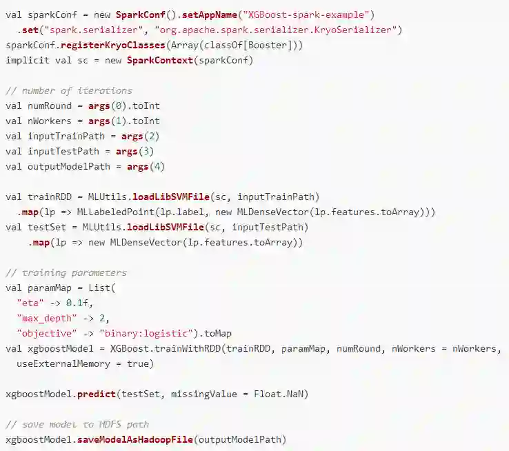 同时,xgBoost提供了基于jvm的实现版本xgBoost4j[5],并且基于Rabit使其可以运行在Spark/Flink等分布式计算平台上。下面是Spark版本的代码片段: