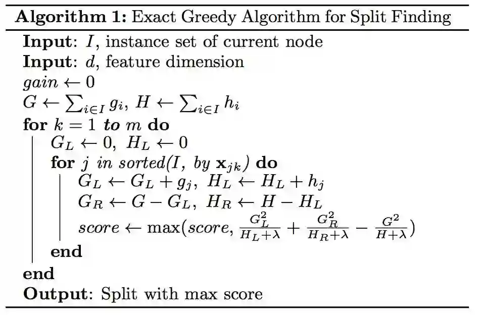 每一次确定当前回归树的分裂方案,我们需要枚举当前所有的叶子节点(特征)和每个叶子节点中的所有特征值的增益,进而选取最大增益对应的分割,xgBoost也给出了枚举方案: