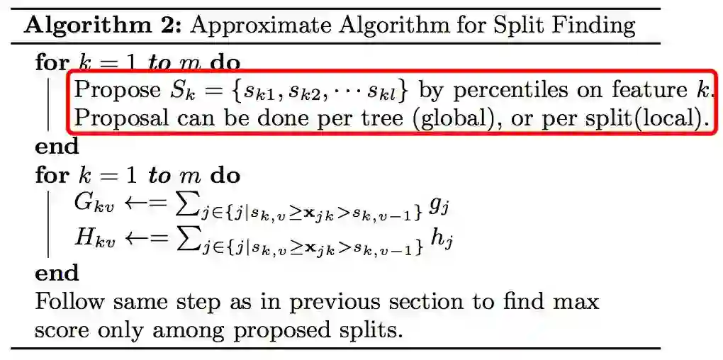 同时,由于上述暴力枚举的复杂较高,xgBoost也设计了近似分裂方案:针对每个树(global),选取候选分裂结点,针对每个特征(local),只枚举特定分位数对应的特征值。 具体如下: