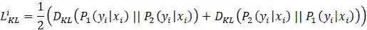 具体来说,当给定训练数据 D={x_i,y_i }_(i=1)^n 后,对于每个训练样本 x_i,会经过两次网络的前向传播,从而得到两次输出预测:P_1 (y_i│x_i ), P_2 (y_i |x_i)。由于 Dropout 每次会随机丢弃部分神经元,因此 P_1 和 P_2 是经过两个不同的子网络(来源于同一个模型)得到的不同的两个预测概率(如图1所示)。R-Drop 利用这两个预测概率的不同,采用了对称的 Kullback-Leibler (KL) divergence 来对 P_1 和 P_2 进行约束: