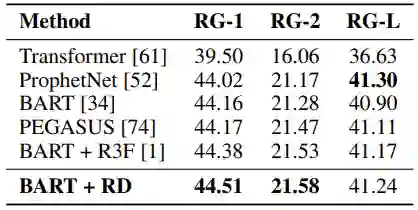4. 在文本摘要任务上,R-Drop 基于 BART [7] 的预训练模型,在 CNN/Daily Mail 数据上微调之后也取得了当前最优的结果:
