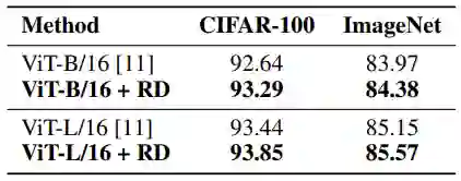 表2:R-Drop 基于 Vision Transformer 在 CIFAR-100、ImageNet 微调后图像分类的结果