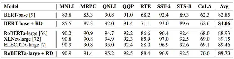 表3:R-Drop 在 GLUE 语言理解的验证集上的微调结果