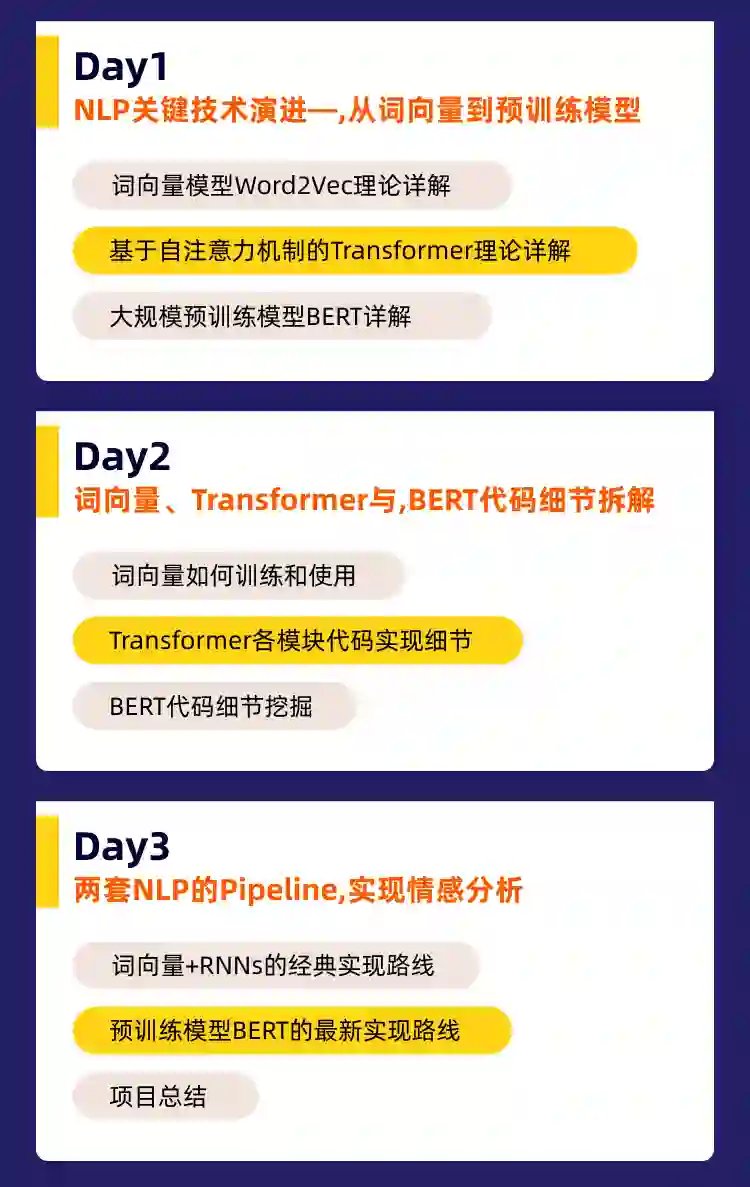 本次训练营为期3天,主要分为三个模块。NLP关键技术演进-从词向量到预训练模型;词向量、Transformer与BERT代码细节拆解;两套NLP的Pipeline实现情感分析。